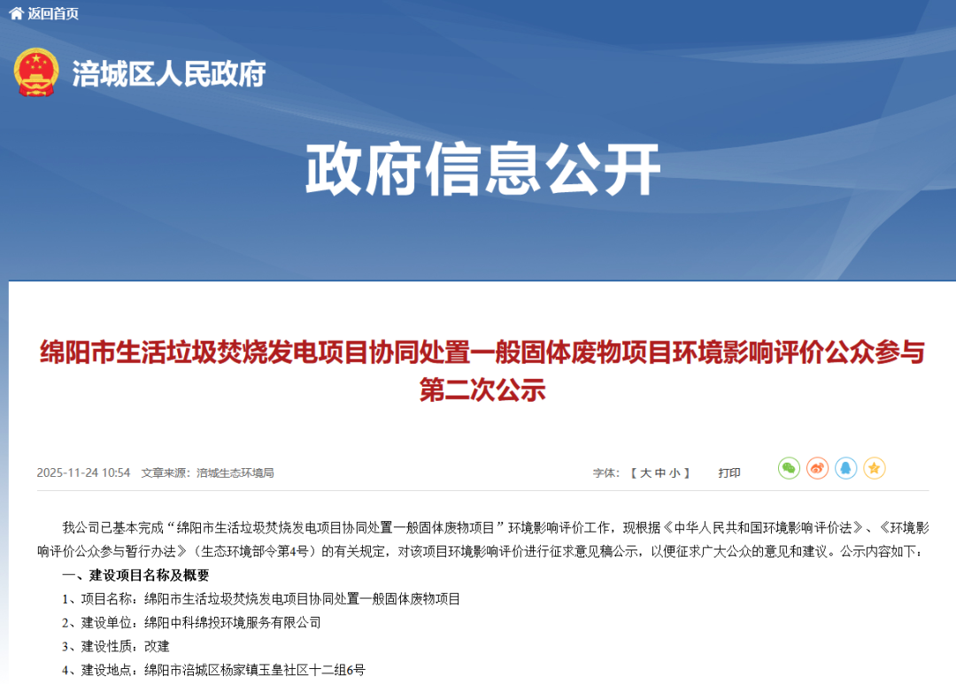 中国固废网从E20环境平台标讯采集系统E标通获悉,日前,四川绵阳市生活垃圾焚烧发电项目协同处置一般固体废物项目环境影响评价公众参与第二次公示。