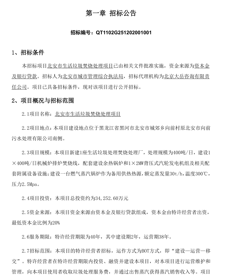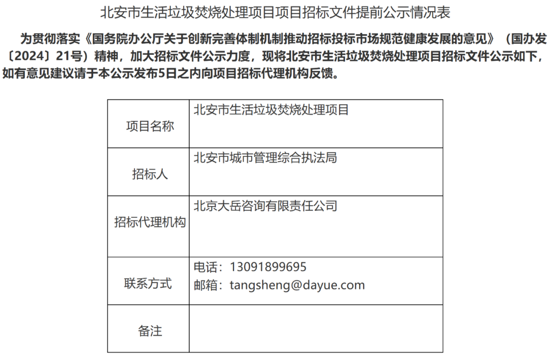 中国固废网从E20环境平台标讯采集系统E标通获悉,日前,黑龙江省北安市生活垃圾焚烧处理项目项目招标文件提前公示情况表发布。